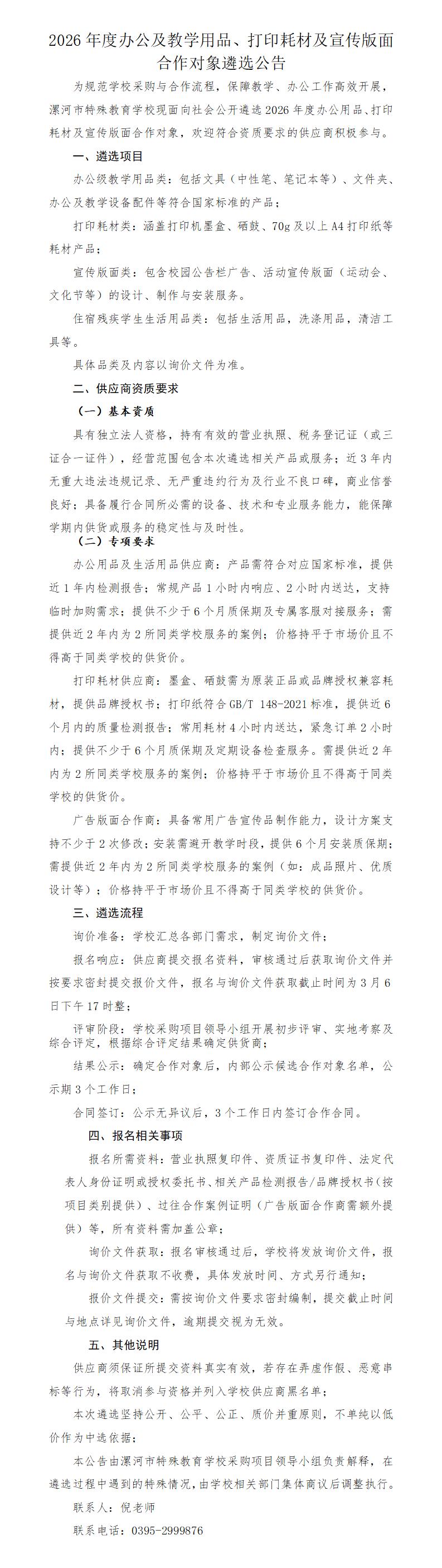 2026年度办公及教学用品、打印耗材及宣传版面 合作对象遴选公告
